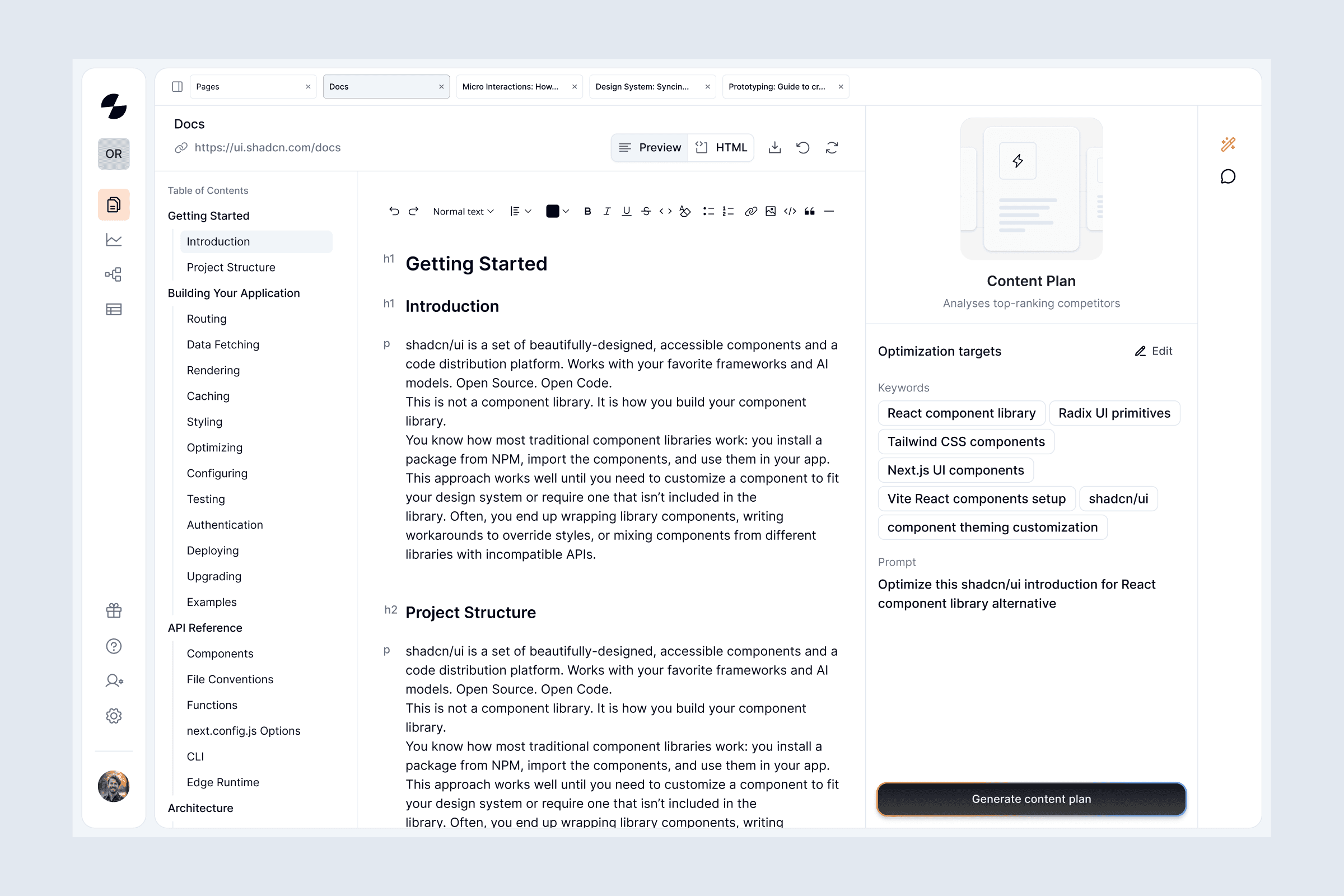 And now the centerpiece, content plan generation. Instead of hiding the keyword and prompt inputs behind a dialog box, I needed to find a way to make this feel like a natural part of the workflow. The challenge was making it accessible without getting in the way.