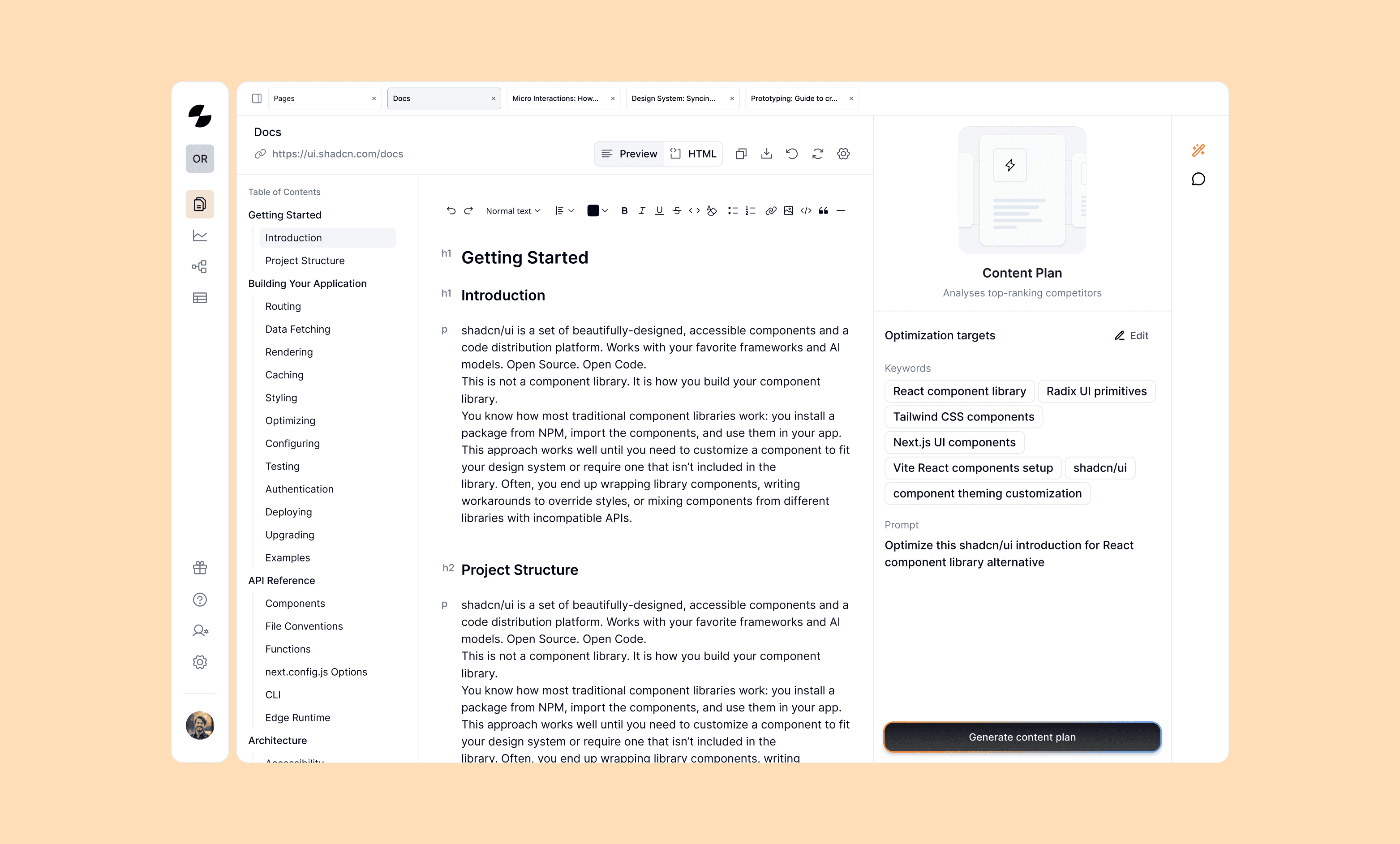 Redesigned a content optimization platform's content generation workflow, reducing user steps and reclaiming 40% of screen space, and eliminating friction that blocked users from core functionality.